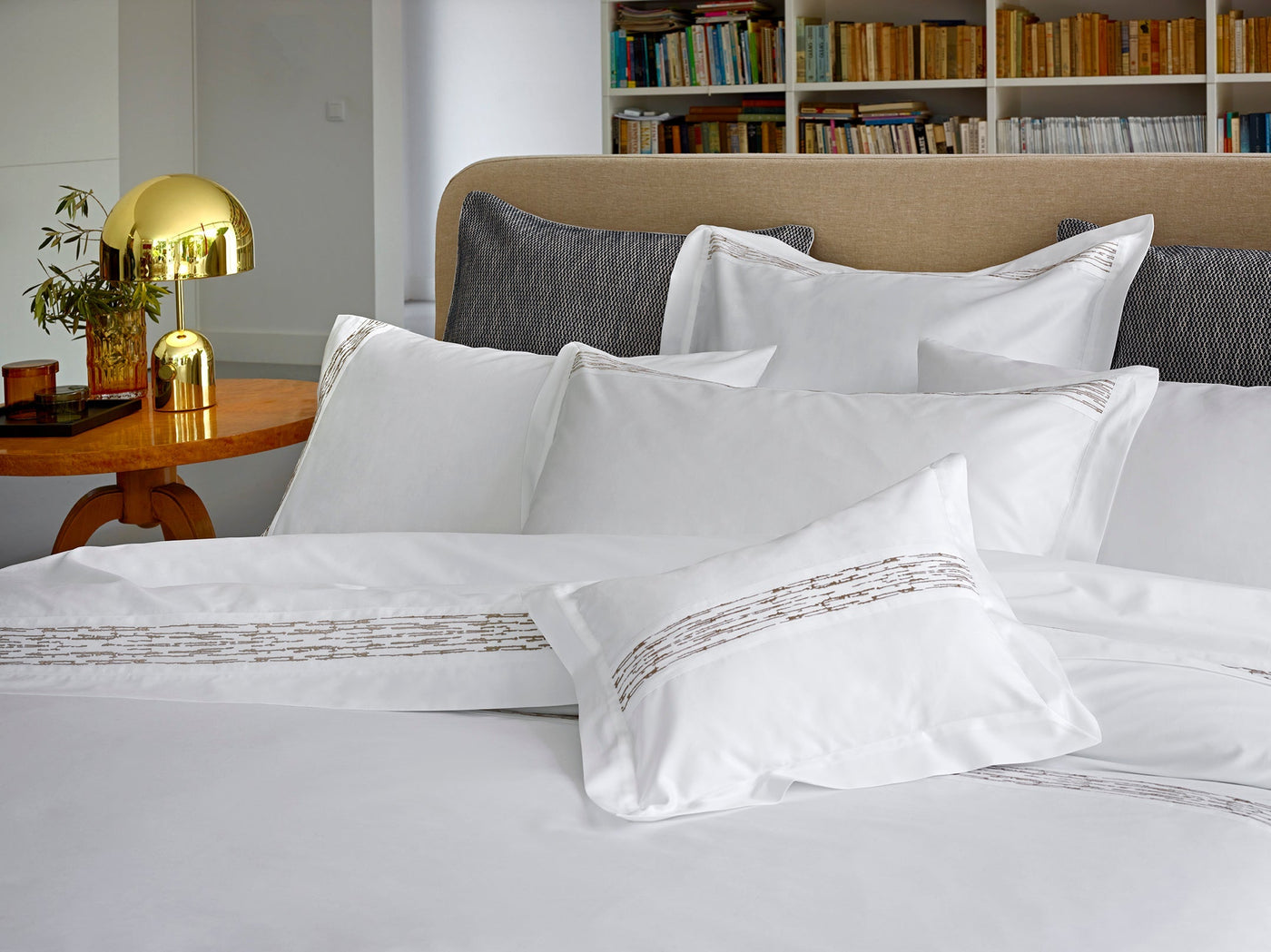 The collection draws inspiration from Portugal's plowed lands, which yield sprawling vines for fine wine, sturdy cork trees, and stout olive groves. Finished with a playful, modern, and geometric embroidery mimicking the land. Choose from rich, neutral shades including warm, pearl and midnight.