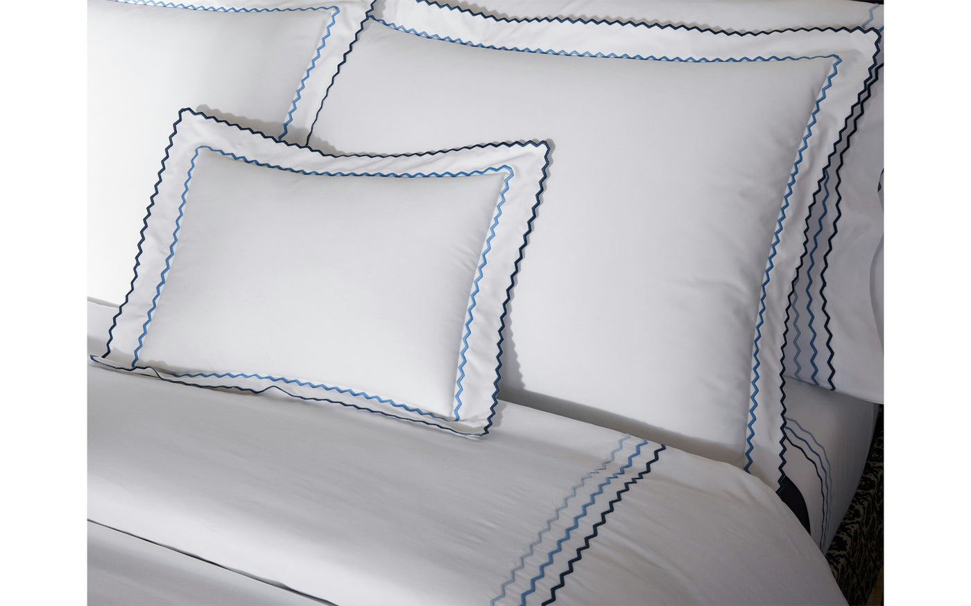 Axel is a lively offering that features playful zigzag embroidery in a variety of color combinations. Woven from long-staple cotton for an exceptionally soft hand, Axel lends a spirited energy to the modern bed with its graphic stitched trim.