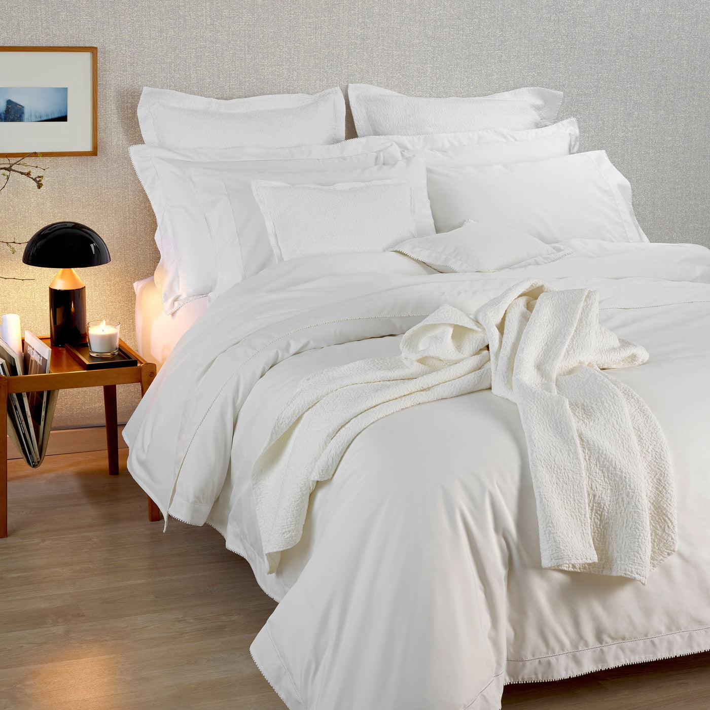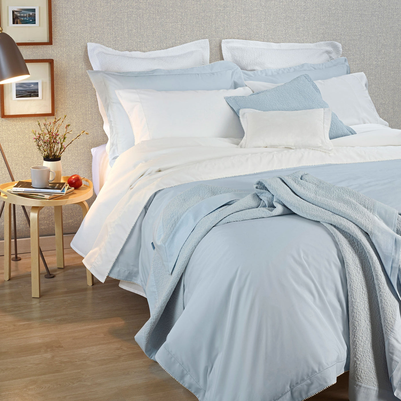 A luxurious and timeless percale, woven from the perfect blend of premium cotton and fine silk, and finished with a stunning hemstitch.