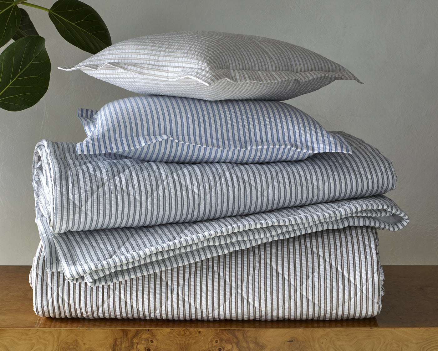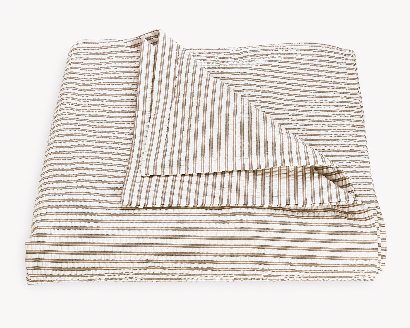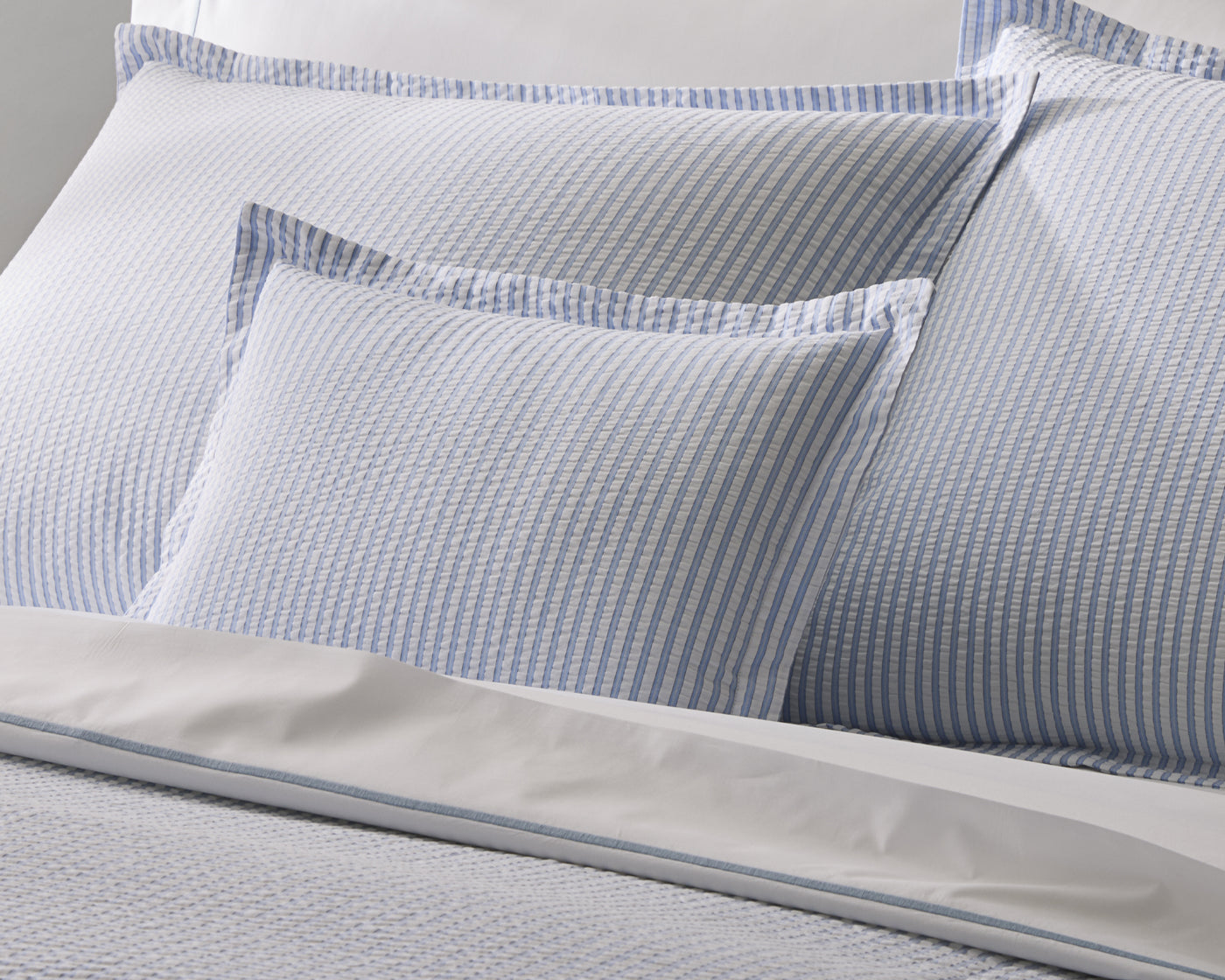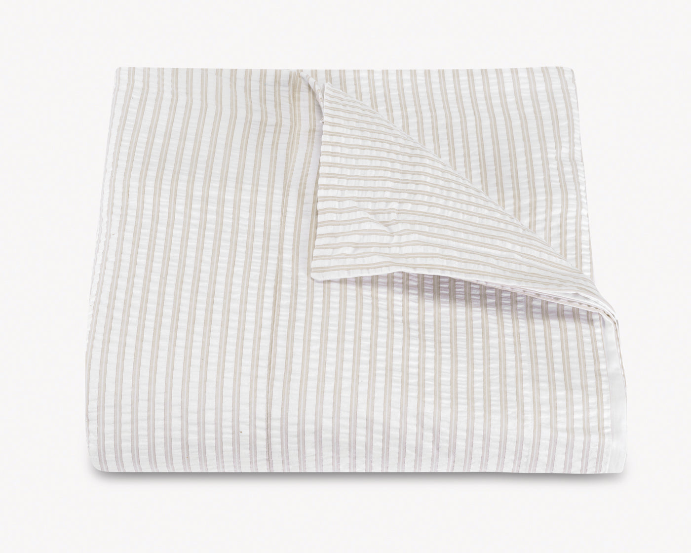 Seersucker stripe with the sophistication of elegant menswear, finished with a 1-inch flange. 100% cotton seersucker, woven in Portugal.