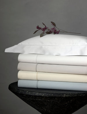 A delicate hemstitch frames our signature sateen sheeting for an effect that is luminous and sophisticated, but never stuffy. Available in a select palette of classic neutral colors and made of 600 thread count Egyptian cotton woven in Italy.