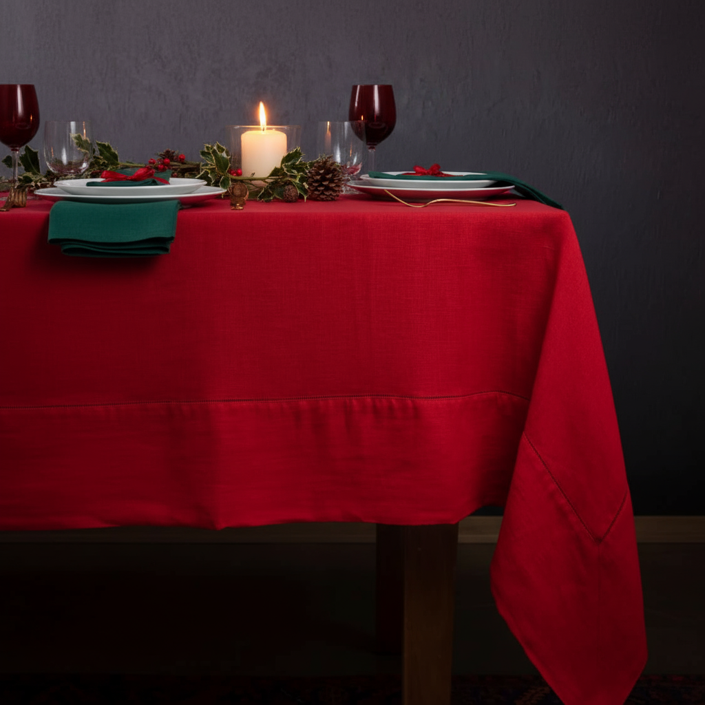 Each piece is finished with a classic hemstitch border and tailored for lasting style and durability. The collection includes cocktail napkins, dinner napkins, placemats, table runners, and tablecloths—each available in both red and green—so you can build a coordinated look for everything from intimate dinners to full holiday celebrations.