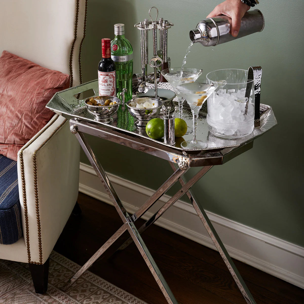 Each piece of hammered stainless steel barware is handmade and polished to brilliance.