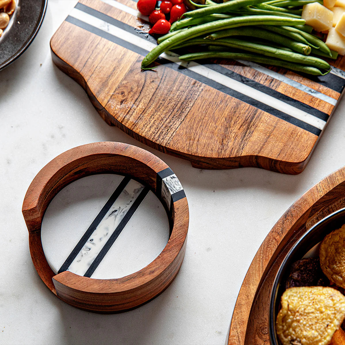 The serving board contains a large marble center that is perfect for serving and cutting. Between layers of rich Acacia Wood are stripes of hand-marbled resin -a juxtaposition of rustic and refined artisanal materials.
