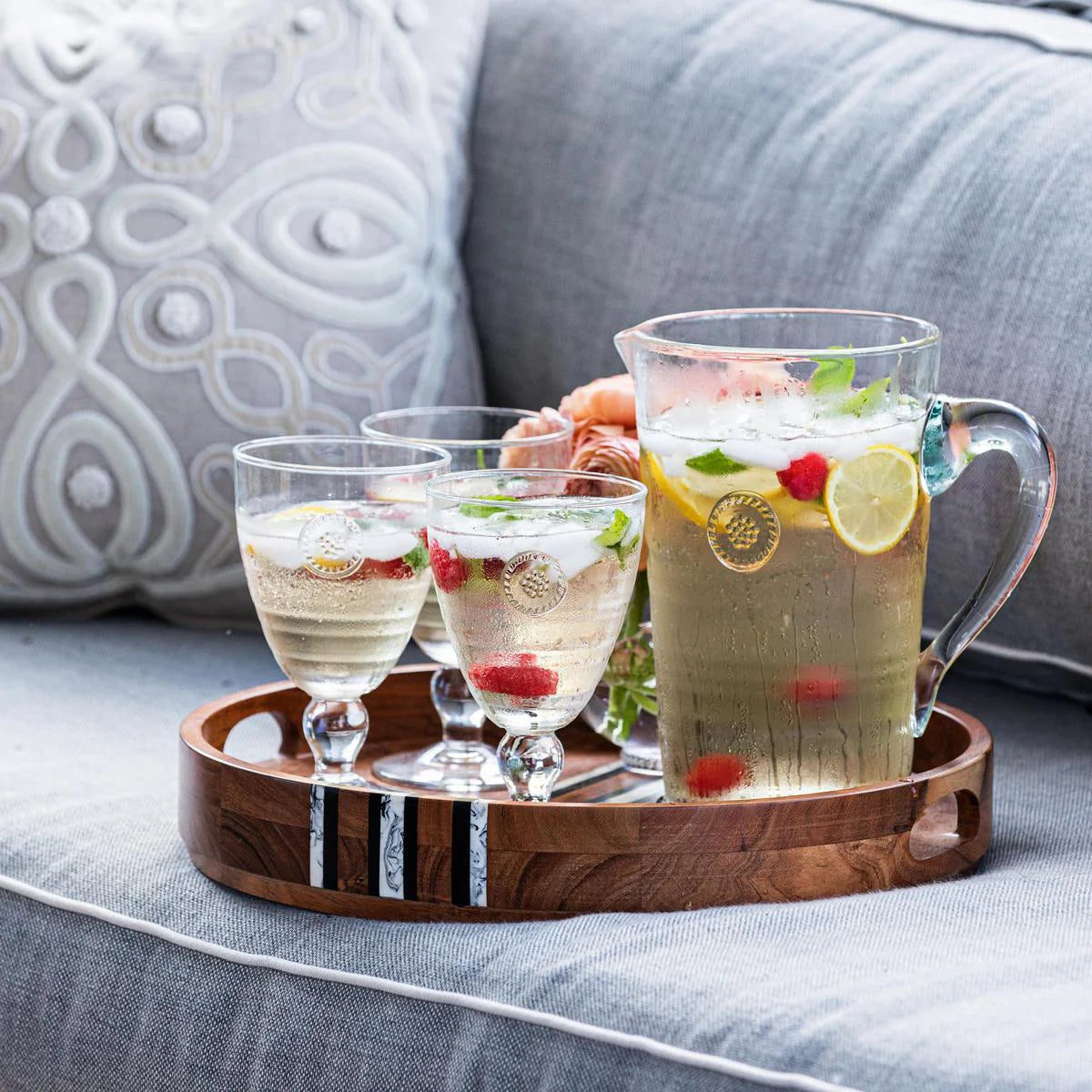 Rich layers of acacia wood and stripes of hand marbled resin are juxtaposed to create the distinct, unique look of Juliska's Stonewood Stripe collection.