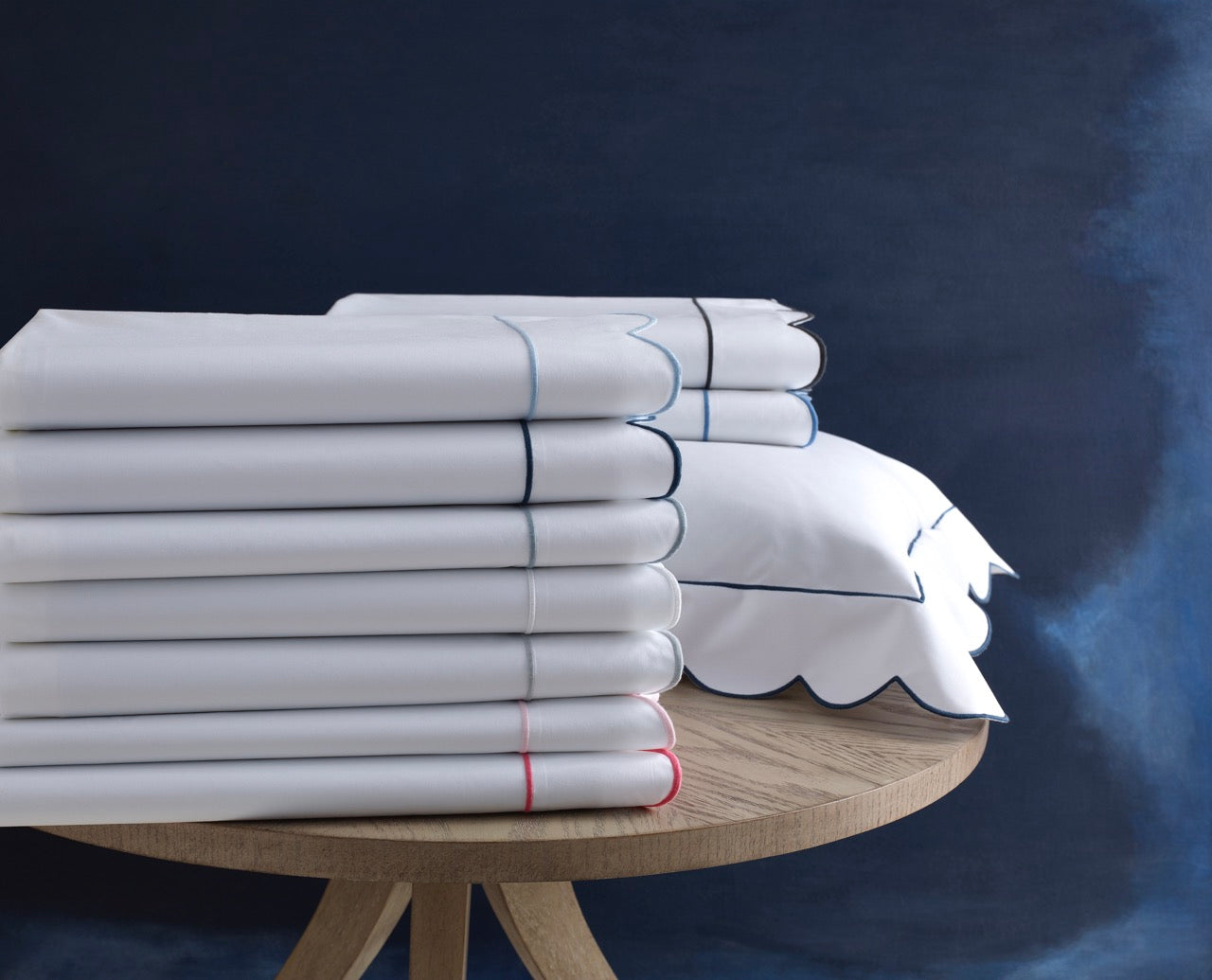 The fitted sheet of the Butterfield collection is Luca's 500 thread count percale sheeting, finely woven for a smooth touch. The fitted sheet does not feature the scalloped detail or satin stitching.