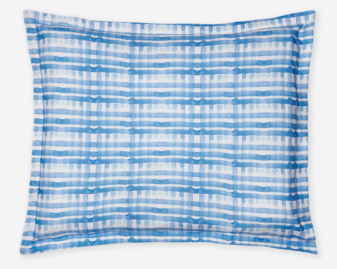 Plaidino is a charming plaid collection in watercolor brushstrokes of French blue. In the coordinating Tratto, a double border of blue satin-stitch makes a stylish statement. Together, these pieces transform the bedroom into a serene blue sanctuary.